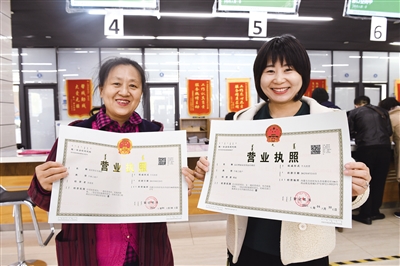4月30日,包头市昆都仑区106小商品批发市场商户在展示刚更换的营业执照。当日,为优化营商环境,包头市昆都仑区组建行政审批和政务服务局,第一批将发改委、财政局、农牧局、商务局等15个行政部门的147项行政审批事项集中划转,实现“一枚印章管审批”,办事只需跑一次,节约办事时间。本报记者 孟和朝鲁 摄