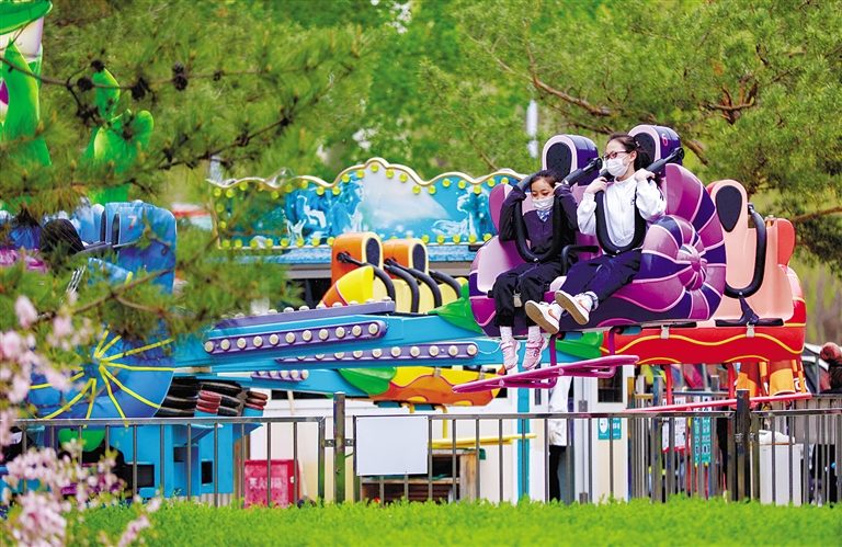 5月4日,游客在呼和浩特市阿尔泰游乐园体验游乐设施。“五一”假期,首府市民纷纷走出家门到旅游景区游玩,在欢声笑语中度过节日。本报记者 王磊 摄