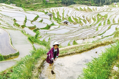 5月3日,贵州省从江县加榜乡加页村村民在梯田上劳作。眼下,贵州省黔东南苗族侗族自治州从江县加榜乡进入农忙季节,农民们抢抓农时管护稻田和秧苗。