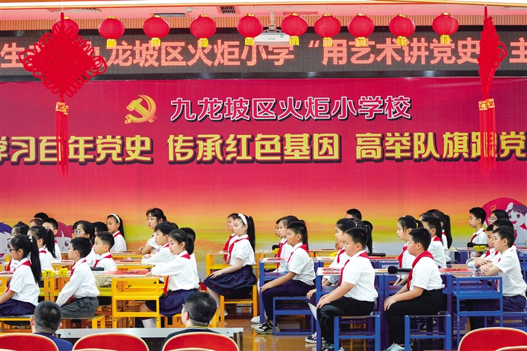 5月14日,火炬小学校的学生参加主题队会活动。当日,共青团重庆市九龙坡区委联合四川美术学院,在当地火炬小学校开展了一场主题队会活动。来自四川美术学院的老师,以《收租院》群雕、《冬去春来》群雕等艺术作品为案例,向学生们介绍了当代艺术家如何用主题雕塑手段反映中国共产党领导人民开展社会主义建设的探索和发展成就,将艺术知识普及与党史宣讲有机结合,推动党史学习教育深入青少年的心中。