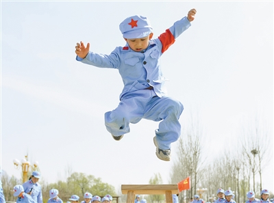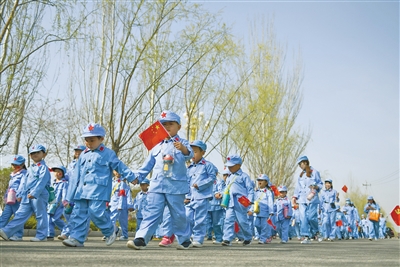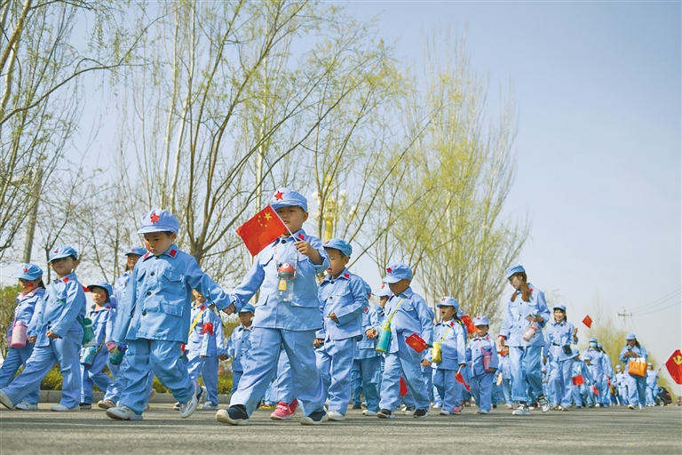 活动中,来自该园11个班级的300多名幼儿统一换上红军服,带上军帽,徒步行走2.5公里体验长征的艰辛,感受团结互助、勇往直前的精神力量。