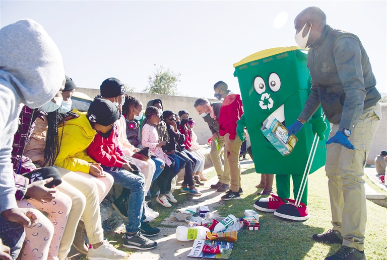 6月5日,老师在南非比勒陀利亚给学生讲解垃圾分类知识。当日,数百人在南非比勒陀利亚的公园和社区内参加今年世界环境日的相关活动,通过捡拾垃圾来保护环境,并通过环保教育和废物回收知识讲解等让小学生们了解更多环保知识。联合国于1972年确定6月5日为世界环境日。今年世界环境日的主题为“生态系统恢复”。