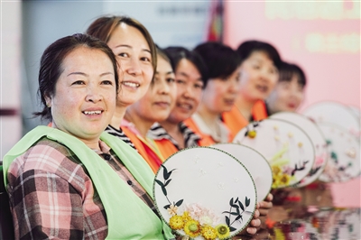6月11日,建筑女工正在展示做好的团扇。当日,呼和浩特市文化志愿者、“五一巾帼标兵”董存娥来到中央民族大学附属中学呼和浩特分校项目工地教建筑女工制作传统手工艺品——团扇,迎接端午节。团扇是我国的传统手工艺品,此次活动制作的干花团扇,将传统工艺与现代插花艺术结合,赋予团扇新的艺术生命。团扇寓意团圆、和美,以此祝福坚守工地的工人们端午节和和美美、幸福安康。 本报记者 孟和朝鲁 摄