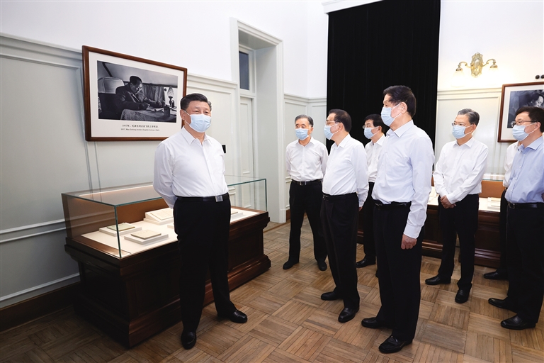 25日下午,习近平带领中央政治局同志来到北大红楼,参观“光辉伟业 红色序章——北大红楼与中国共产党早期北京革命活动主题展”,重温李大钊、陈独秀等开展革命活动、推动马克思主义在中国早期传播、酝酿和筹建中国共产党等革命历史。展厅内,一张张图片、一件件文物,全面展现了那个时期的光辉历史。习近平不时停下脚步,询问相关细节。他指出,北大是新文化运动的中心和五四运动的策源地,最早在我国传播马克思主义思想,也是我们党在北京早期革命活动的历史见证地,在建党过程中具有重要地位。要加强红色资源保护和利用,尊重历史事实,准确评价历史,正确学史用史。