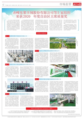 赤峰东黎羊绒股份有限公司等5家组织 荣获2020年度自治区主席质量奖
