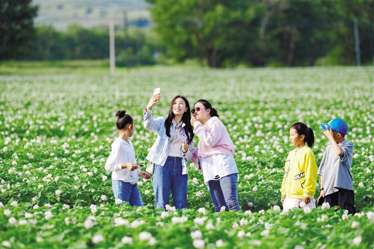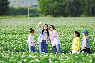 日前,游客在位于乌兰察布市的内蒙古民丰种业公司卓资山农场马铃薯地里观光。盛夏时节,被称为“中国薯都”的乌兰察布市300多万亩马铃薯进入开花期,众多白色的花朵闪烁于绿野之中,一派丰收在望景象。近年来,当地政府持续推进“公司+基地+农户”的发展模式,提高马铃薯良种繁育能力和精深加工转化率,形成了东西长250公里的马铃薯产业带,马铃薯已发展成为大产业。