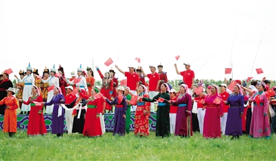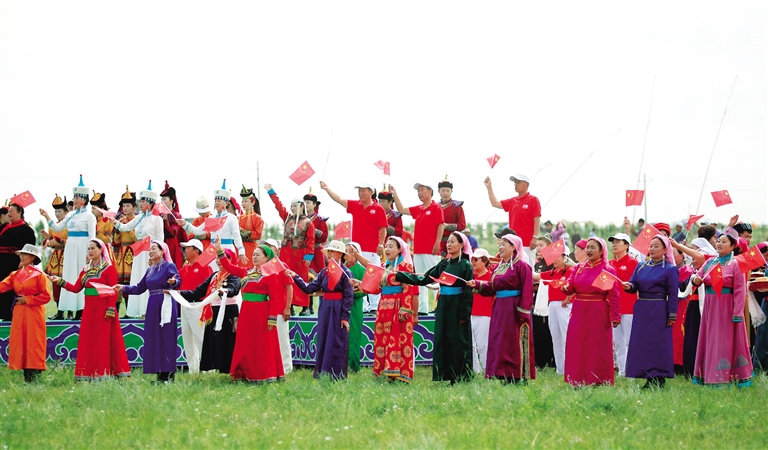 7月30日上午,锡林郭勒盟各族群众载歌载舞迎接草原的节日。当日,2021锡林郭勒生态旅游嘉年华活动在锡林郭勒草原火山地质公园拉开帷幕。嘉年华期间,该盟将举办涵盖体育、户外、旅拍、美食等多种旅游元素的摔跤比赛、音乐节、草原旅拍打卡站、奶酪美食品鉴汇、草原游客三项赛等大型生态旅游活动。本报记者 巴依斯古楞 毕力格巴特尔 摄