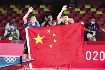7月30日,马龙(前右)和樊振东在比赛后共展国旗。当日,在东京奥运会乒乓球男子单打决赛中,中国选手马龙战胜队友樊振东,夺得冠军。