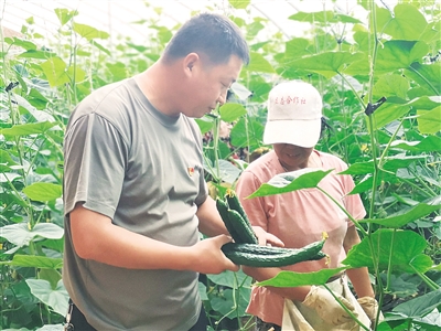 南立志(左)的大棚黄瓜喜获丰收。