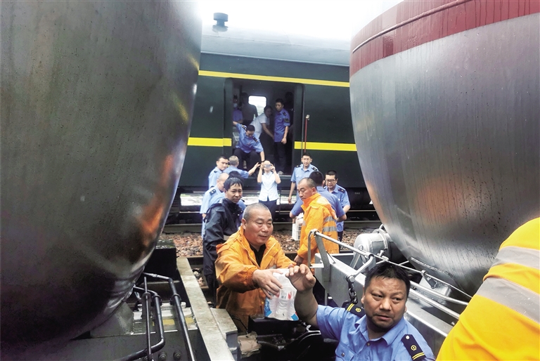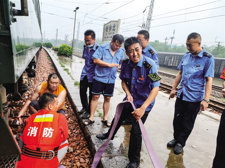 由于长时间运行和滞留,列车用水告罄。经多方协调,当地政府组织消防车为列车注水。赵磊、陆超带着乘务组蹚着没过小腿的积水,将水带接上列车,解决了燃眉之急。