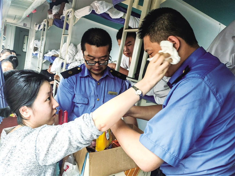 旅客为忙碌的列车工作人员擦拭汗水。高颜 摄