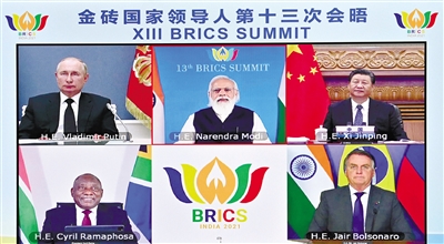 五国领导人围绕“金砖15周年:开展金砖合作,促进延续、巩固与共识”主题深入交流,通过了《金砖国家领导人第十三次会晤新德里宣言》。