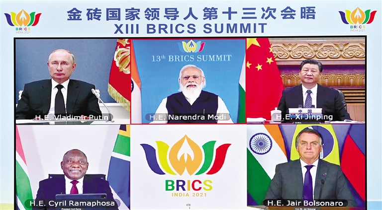 五国领导人充分肯定金砖合作15年来取得的成就,认为今年以来面对前所未有的挑战和复杂国际形势,五国携手抗击新冠肺炎疫情,推动各领域合作取得丰富成果,提升了新兴经济体国家的地位,愿继续共同努力,深化金砖战略伙伴关系,推动金砖合作取得更多务实成果。五国领导人表示,将继续推动全球团结抗疫,反对将病毒溯源政治化,愿加强公共卫生和疫苗合作,推动疫苗公平可及,促进世界经济强劲复苏,努力实现2030年可持续发展目标。各方重申支持多边主义和国际关系基本准则,反对单边主义、霸权主义,主张各国相互尊重独立、主权和平等,将就重大国际和地区问题加强沟通协调,合力应对气候变化,推动构建人类命运共同体。巴西、俄罗斯、印度和南非支持中国主办北京冬奥会、冬残奥会,支持中国2022年金砖主席国工作并主办金砖国家领导人第十四次会晤。