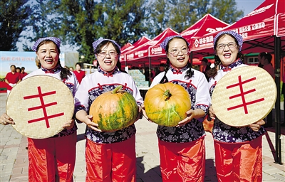 9月10日,村民在展示大南瓜。当日,第四届“南瓜节暨农产品交流会”在呼和浩特市赛罕区黄合少镇格此老村举行,村民们载歌载舞庆丰收,与游客分享喜悦心情。活动现场,黄合少镇各村村民还展示了网纹瓜、小南瓜、葡萄、火龙果等特色农产品。