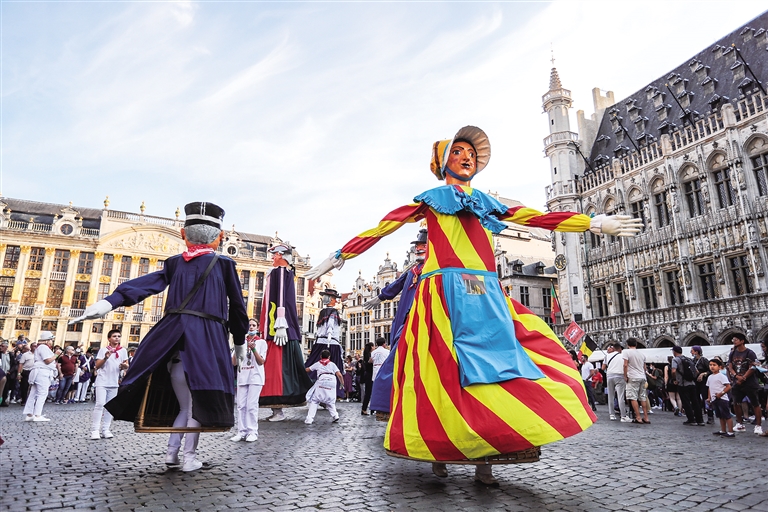 比利时布鲁塞尔:欢乐民俗节 9月18日,装扮成“巨人”的演员在比利时布鲁塞尔大广场的民俗节活动上为观众表演。当日,为期两天的民俗节在比利时布鲁塞尔大广场及周边街区拉开帷幕。 新华社记者 郑焕松 摄
