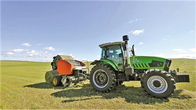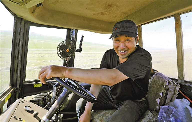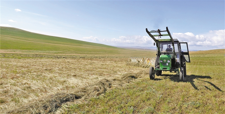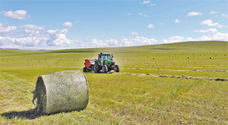 鄂温克族自治旗辉苏木乌兰托格嘎查牧民扎拉森尼玛驾驶着打草机耕耘在草原深处。割倒的牧草被搂草机梳理成垄,然后再被捆草机卷成紧实的干草捆。牧草丰收,坚定了他发展现代畜牧业的信心。鄂温克旗林草局林草事业发展中心主任巴达日乎说,今年牧草草质好,牧民们提前进入了打草季,全旗预计能打2.5亿斤牧草,可保障牲畜安全越冬。