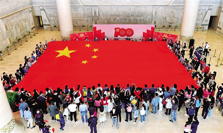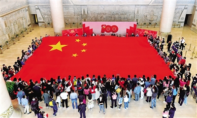 祝福祖国10月1日,参观者汇聚在内蒙古博物院一面巨大的国旗前,大声说出对祖国的祝福。国庆期间,举国欢庆,内蒙古博物院开展了“五星红旗飘 共筑中国梦”“听故事寻国宝”“一起来玩围鹿棋”等8个线上线下活动,祝福祖国繁荣昌盛。 本报记者 王磊 摄