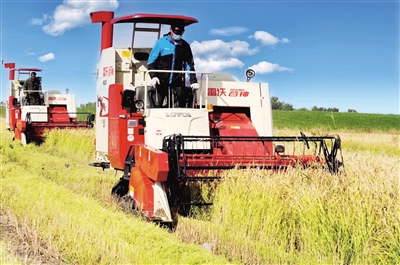 不远处,稻田内,几台大型收割机正忙碌着,田地间奏响了丰收的欢歌。