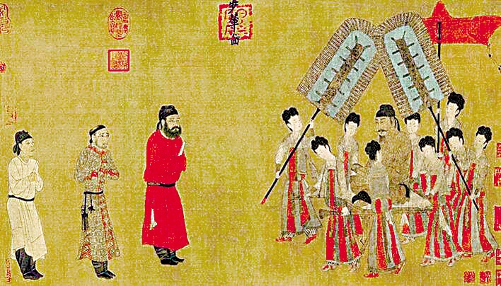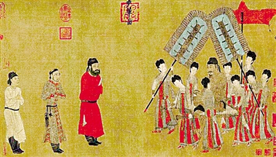 收藏于北京故宫博物院的《步辇图》是唐朝画家阎立本的传世名作之一,也是中国十大传世名画之一。该图为绢本,纵38.5厘米,横129.6厘米。