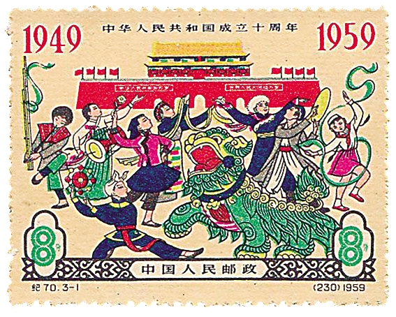 1959年10月1日,在中华人民共和国建立十周年之际,邮电部发行了5组19枚纪念邮票以作庆祝。如图这枚邮票一套共三枚,这是第一枚,邮票志号“纪70(编号230)”,表现了各族人民欢呼雀跃向国庆献礼的热烈场景。主图背景为雄伟壮观的天安门城楼,鲜艳的五星红旗迎风飘扬,大红灯笼悬挂在城楼上,展示着中华民族屹立于世界东方的巍巍雄姿。在广场上,全国各族人民身着崭新鲜艳的民族服饰,演奏着各种乐器,兴高采烈,翩翩起舞。图案的最前面是舞狮的情景,一青年身穿传统服装,头戴羊肚巾,束红腰带,手持绣球引舞。一只绿身、红嘴、金黄卷毛、威风凛凛的雄狮跳跃翻滚,身姿灵活,热情奔放,让人联想到东方睡狮已醒,仰天长啸,发出震惊世界的吼声。