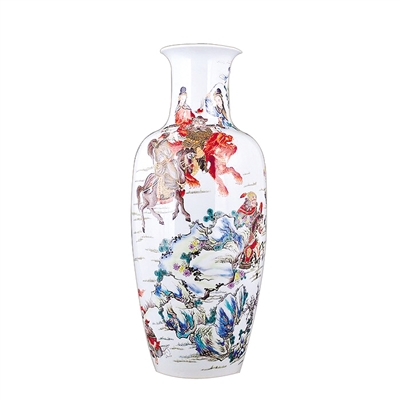 瓷瓶制作于清代晚期,高45厘米,底部直径18厘米。瓷瓶口外侈,束颈,溜肩,直筒形腹,腹下略收,足尖圆滑,是典型的清代软棒槌瓶造型。瓷瓶通景粉彩绘昭君出塞图,但见怪石林立,古松参天,昭君策鞭骑马出塞,侍从随后。塞外猎人骑马狩猎,惊恐的奔鹿,张望的野兔,描绘出一幅生动的塞外风景。瓷瓶底部松石绿釉阴刻“慎德堂制”四字二行楷书款。“慎德堂制”款的瓷器为道光御用品。