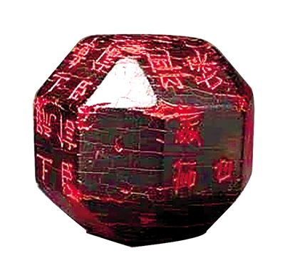 1981年出土于陕西省旬阳县的独孤信多面体煤精组印,高4.5厘米,宽4.3厘米,为西魏时期文物。该印的材料和形制非常特别,材质为煤精,是距今1.5亿年前的一种特殊的树木埋藏于地下经过地壳变动,夹杂在煤层中间形成的混合煤,其质量坚韧、细密,有煤中之王、黑宝石之称,非常稀有。印形呈球体8棱26面,印面边长均为2厘米,有的因棱角磨损,只有1.8或1.9厘米;通体高4.5厘米、宽4.35厘米,重75.7克。因年久侵蚀,印体表层已有多道裂纹,局部剥落,棱角略有残损。26面中,2厘米长的正方形印面18个,三角形印面8个,为半正多面体。在18个正方形印面中,有14个正方形印面镌刻印文。印文的内容由公文用印、上书用印和书简用印三大类组成。公文用印如“大都督印”“大司马印”“刺史之印”“柱国之印”“令”“密”;上书用印如“臣信上疏”“臣信上章”“臣信上表”“臣信启事”;书简用印如“独孤信白书”“信白笺”“信启事”“耶敕”,为古代公文书信研究提供了佐证。印文为楷书阴文,书法遒劲挺拔。