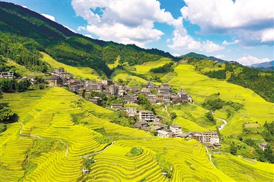 这是10月1日拍摄的广西桂林市龙胜各族自治县龙脊梯田秋日景观(无人机照片)。金秋十月国庆假期,神州大地秋高气爽,山河锦绣,构成一幅幅美丽的画卷。 新华社发
