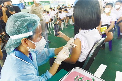 10月4日,学生在泰国曼谷一所学校接种新冠疫苗。泰国10月4日起开始为12至18岁的学生接种新冠疫苗,以迎接11月开始的新学期。 新华社发