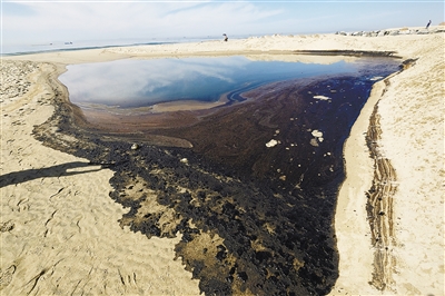 这是10月3日在美国加利福尼亚州奥兰治县亨廷顿比奇市的海滩拍摄的原油。美国加利福尼亚州南部奥兰治县海岸日前发生严重原油泄漏事故,截至3日中午海面上已形成近35平方公里的污染带,原油泄漏量达12.6万加仑(约合47.7万升),给当地生态环境造成严重威胁。 新华社发