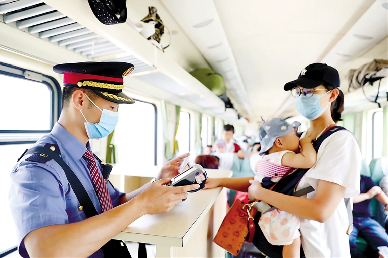 10月5日,Z267次列车值班员杨双正在为旅客办理补票业务。为迎接国庆假期返程客流高峰,呼和浩特客运段提前准备、加强旅客上下车引导,为旅客出行提供更安全、更优质的服务。