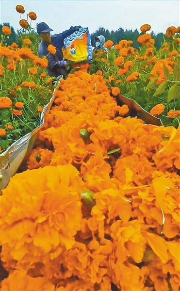 千亩农田变景观,万寿菊种植在提升农业产值、带动周边劳动力就业的同时,也增加了农民的收入。万寿菊成活率高,花期长,可采摘7茬,而且病虫害少、田间管理简单、劳动强度低,平均每亩产量达3吨到4吨,成熟的花朵市场价为0.5元每株,亩产净效益1000元以上。如今,万寿菊不仅成为音德尔镇、好力保镇优化产业结构的“法宝”,更成为吸引游客的“利器”,真正实现了一“菊”两得。