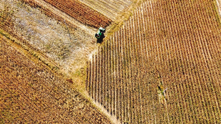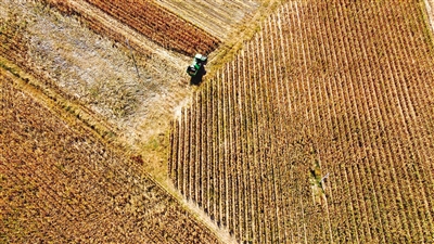 10月15日,航拍下的通辽市科左中旗花吐古拉镇三家子村玉米田里一幅丰收美景。今年,通辽市种植玉米近1600万亩,通过实施浅埋滴灌技术、推广良种良法、优化品种及加强宣传培训和技术服务等措施,有效保证玉米丰产。