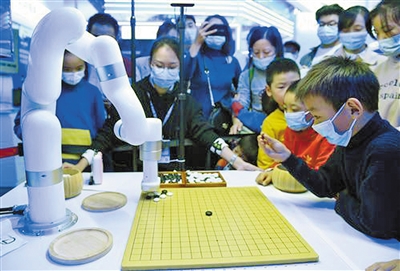小朋友在第四届世界声音博览会上和机器人下棋。近日,在合肥举行的第四届世界声音博览会暨科大讯飞全球1024开发者节,吸引不少市民前来参观体验。声博会现场设立AI奇趣馆、AI科技馆、AI引力馆、AI共生馆和AI创客馆五大展区,一批与声音相关的AI“黑科技”产品亮相。新华社发