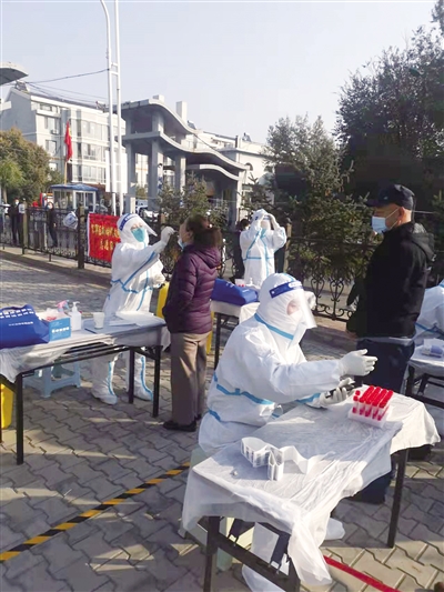 10月29日上午,工作人员正在为呼和浩特市赛罕区阿拉坦社区闻都新苑小区居民进行核酸检测。