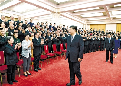 上午11时,习近平等来到人民大会堂北大厅,全场响起热烈掌声。习近平等走到代表们中间,同大家亲切交流并合影留念。