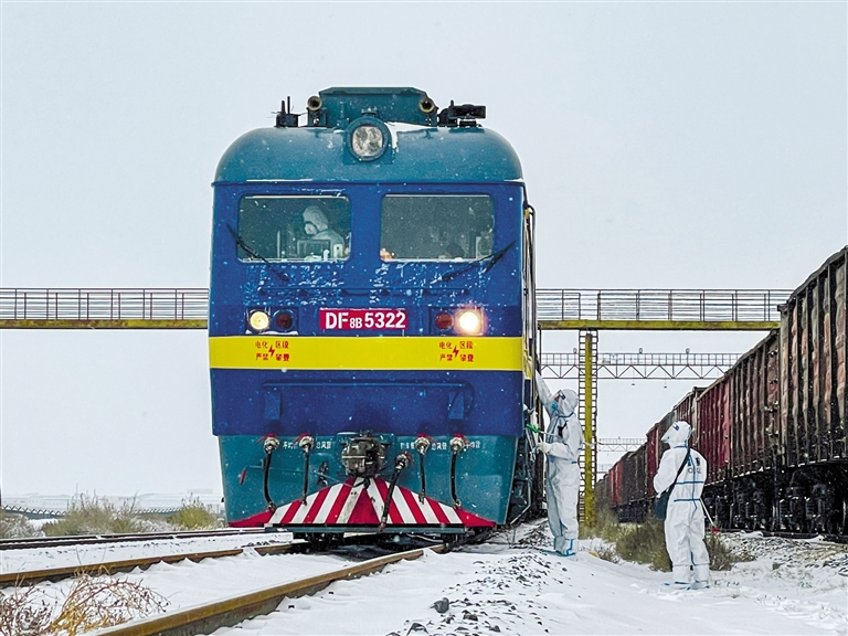 11月6日,二连出入境边防检查站执勤民警顶风冒雪,对通关列车进行检查验放。日前,二连浩特市出现降雪、强降温天气,最低温度降至零下15℃。二连出入境边防检查站民警积极做好恶劣天气下疫情防控、通关服务保障工作,全力保障口岸通关安全顺畅。本报记者 安寅东 摄