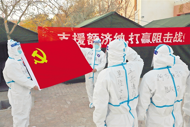 11月4日,阿拉善左旗民兵应急突击队队员在额济纳旗疫情防控一线火线入党。连日来,内蒙古军区动员全区广大民兵积极投身疫情防控一线,配合开展卡口控点、消毒防疫和物资运送等工作。 本报记者 李晗 通讯员 徐博荣 摄