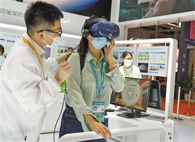 参观者在进博会一处展台通过VR设备体验婴幼儿穿着纸尿裤行走时的感觉。近日,在第四届进博会的消费品展区里,众多“新奇特”展品和“绿科技”应用,成为透视“消费升级”的窗口。新华社发