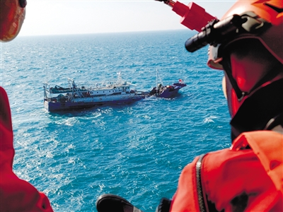12月3日,在韩国丽水附近海域,救援人员乘直升机展开搜救工作。中国驻光州总领馆3日向新华社记者证实,一艘中国渔船当天在韩国全罗南道丽水附近海域触礁,经过搜救,目前船上全部22名中国船员均已获救。 新华社发