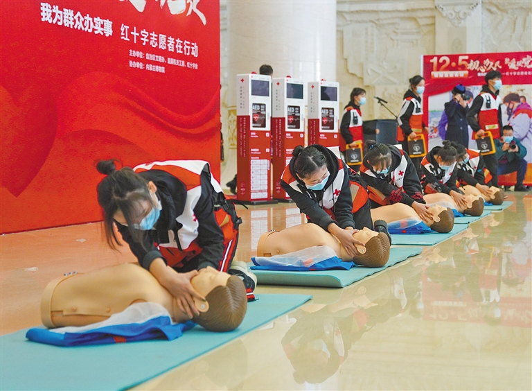 12月5日,由自治区文明办、直属机关工委、红十字会主办的“初心为人民 聚爱跟党走·我为群众办实事 红十字志愿者在行动”第36个国际志愿者日主题活动在内蒙古博物院举行。活动现场进行了捐赠仪式和应急救援演示等志愿服务活动。本报记者 王鹏 摄