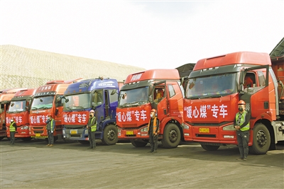 10月24日,一辆辆挂着大红绸、载着“暖心煤”的运煤大卡车排成一列,从鄂尔多斯达拉特旗杭盖沟煤矿整装待发,即将发往位于吉格斯太镇的荣通煤炭物流园区,那里是该镇“暖心煤”的发放点。