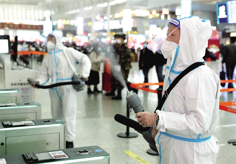 1月21日,工作人员在上海虹桥火车站手持喷雾器对检票闸机进行消毒。今年春运期间,一批具有消毒防疫功能的保洁仪器和清扫机器人在上海火车站、上海虹桥火车站以及上海南站投入使用,织密疫情防控网,保障旅客出行安全。 新华社记者 陈飞 摄