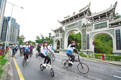 2月3日,活动参与者经过澳门妈祖文化村牌坊。当日,澳门体育局举办“迎冬奥 新春单车行大运”活动,让市民在热闹的气氛中过新年,喜迎即将开幕的北京2022年冬奥会。 新华社记者 张金加 摄