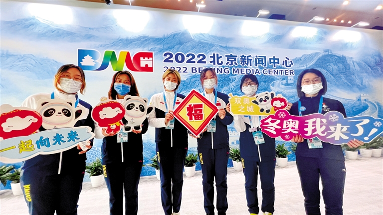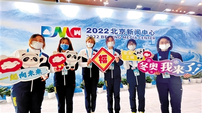 2月5日,在2022北京新闻中心,志愿者为冬奥会送上祝福。