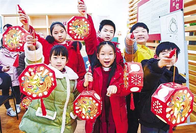 2月11日,小学生在寒假公益托管课堂展示刚做好的元宵花灯。当日,浙江慈溪市钱海军志愿服务中心开设的“复兴少年宫”寒假公益托管课堂开启以“迎冬奥庆元宵”为主题的活动课,为小学生们准备了“手工制作”“冰雪之约”“爱国名人故事会”等内容丰富的趣味主题课程。2021年,中央文明办部署开展乡村“复兴少年宫”建设,面向广大农村中小学和学龄前儿童开展道德培育、文体娱乐、劳动实践等活动。慈溪市作为全国乡村“复兴少年宫”建设50个试点县(市、区)之一,已实现乡村“复兴少年宫”全域覆盖。