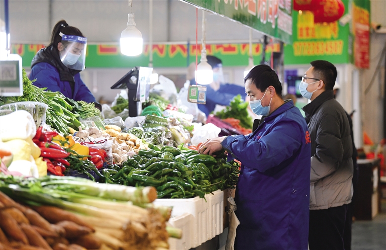 2月20日,市民在呼和浩特市保全庄农贸市场购买蔬菜。记者在市场看到,蔬菜、肉类、生活用品一应俱全,秩序井然。据了解,呼和浩特市出现疫情以来,市场上各类物资供应充足。本报记者 王磊 摄