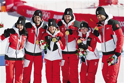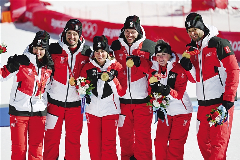 2月20日,冠军奥地利队在奖牌颁发仪式上。当日,北京2022年冬奥会高山滑雪混合团体项目比赛在延庆国家高山滑雪中心举行,奥地利队获得冠军,德国队和挪威队分获二、三名。 新华社记者 陈斌 摄