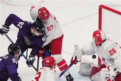 2月20日,双方球员在比赛中。当日,在国家体育馆举行的北京2022年冬奥会男子冰球金牌赛中,芬兰队以2比1战胜俄罗斯奥委会队,获得金牌。