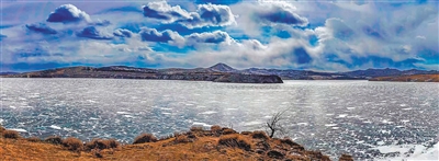 赤峰三座店水库,远山如黛,冰闪银光,白云悠然,美景如画。文/图 刘千祥