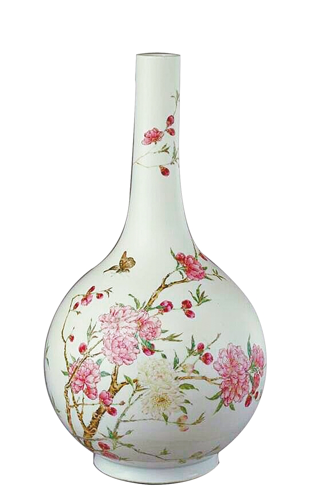 特点:直颈瓶式样典雅,亭亭玉立,于莹白温润之釉面上绘桃花绽放图。一株枝干遒劲的桃花,蔓遍器身,鲜花婀娜,雪白娇红,粉嫩怡人;花蕾待放,娇艳欲滴;绿叶青翠,点缀其间;彩蝶飞舞,春意盎然。胭脂红彩描绘的花朵颜色深浅不同,花心部分色料最厚,从花心到花瓣边沿红色渐趋浅淡。花瓣绿叶似有反侧,尽显春风中摇曳俯仰之姿。外底署青花楷书“大清雍正年制”双行六字款,外围青花双线圈。